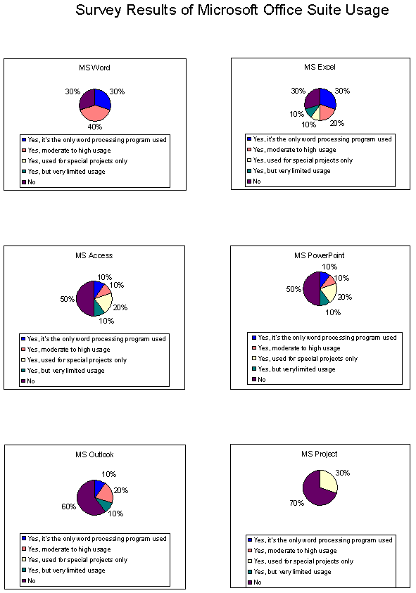 The survey revealed that 70 percent of our respondents used some portion of the Microsoft Office Suite with Word Perfect/Lotus following at 20 percent. However, only 30 percent indicated a familiarity with the MOUS certification offered by Microsoft. Of those familiar with the certification only 10 percent require employees to be MOUS certified and consider the MOUS certification a valid means of measuring computer skills or competency.